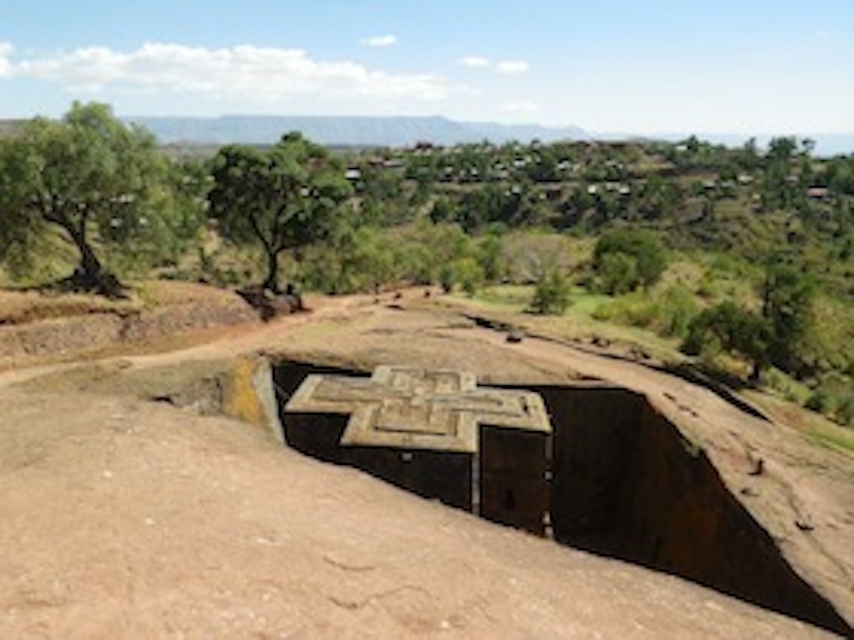 大地を掘られてできた十字型の教会