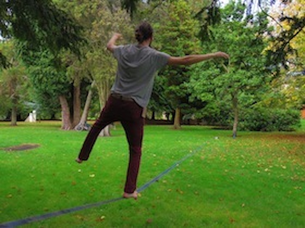 散歩途中、公園でスラックラインをやっている人をみかけた。